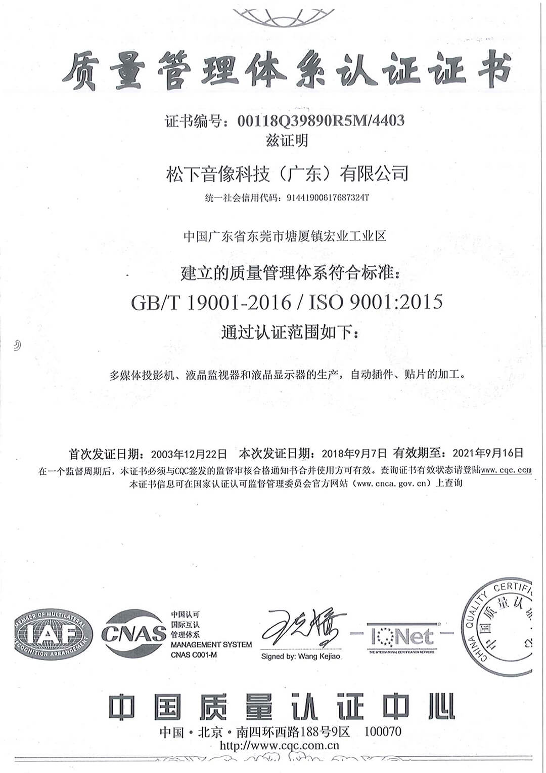 ISO認證三合一_質量管理體系認證證書