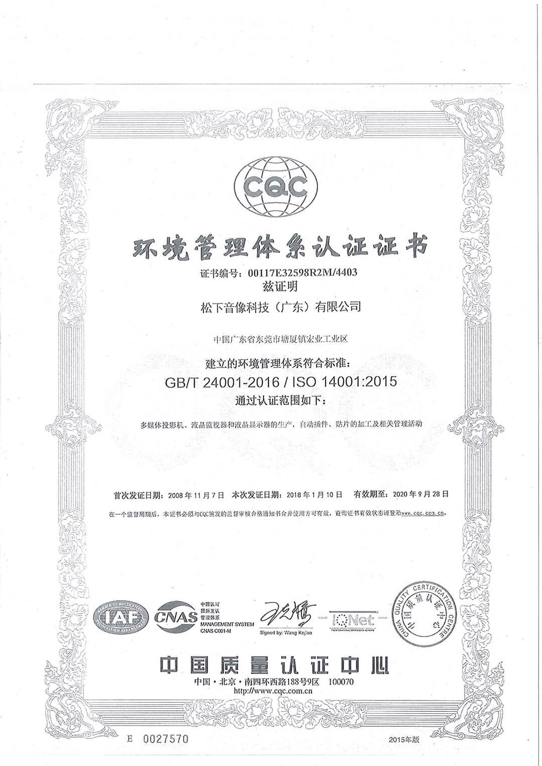 ISO認證三合一_環境管理體系認證證書